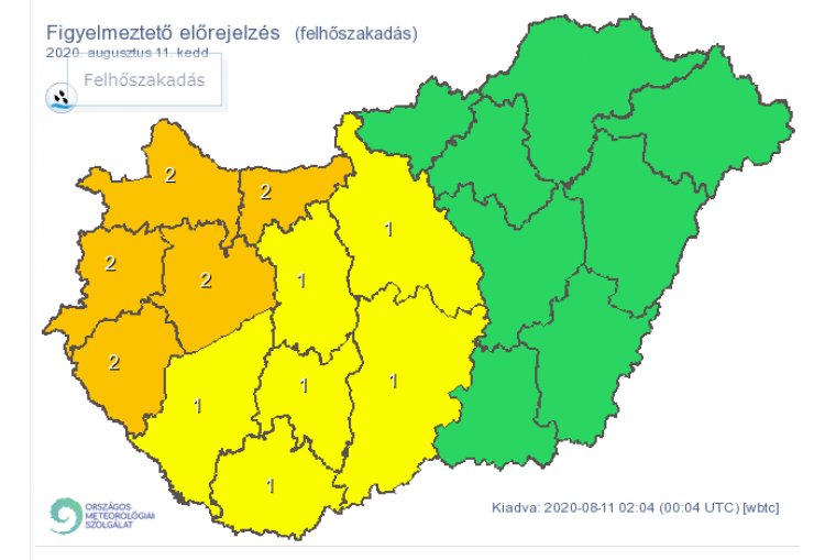 Kedden a Dunántúlon, illetve Duna vonalához közelebb eső alföldi, észak-magyarországi tájakon több helyen várható zivatar. A zivatarokhoz helyenként felhőszakadás (20-50, főként északnyugaton néhol 50-60 mm feletti csapadék), viharos (60-70, egy-egy helyen 70-90 kilométer/órás) szél és jégeső társulhat.