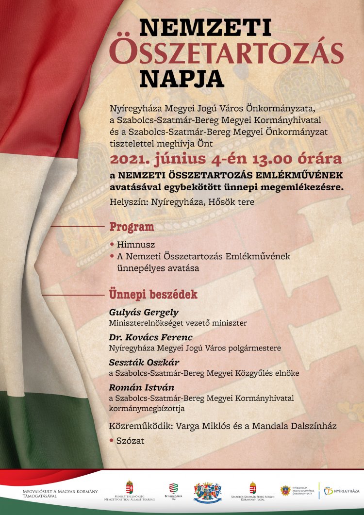 A nemzeti összetartozás emlékművének avatásával egybekötött ünnepi megemlékezést tartanak június 4-én Nyíregyházán, a Hősök terén. A program: