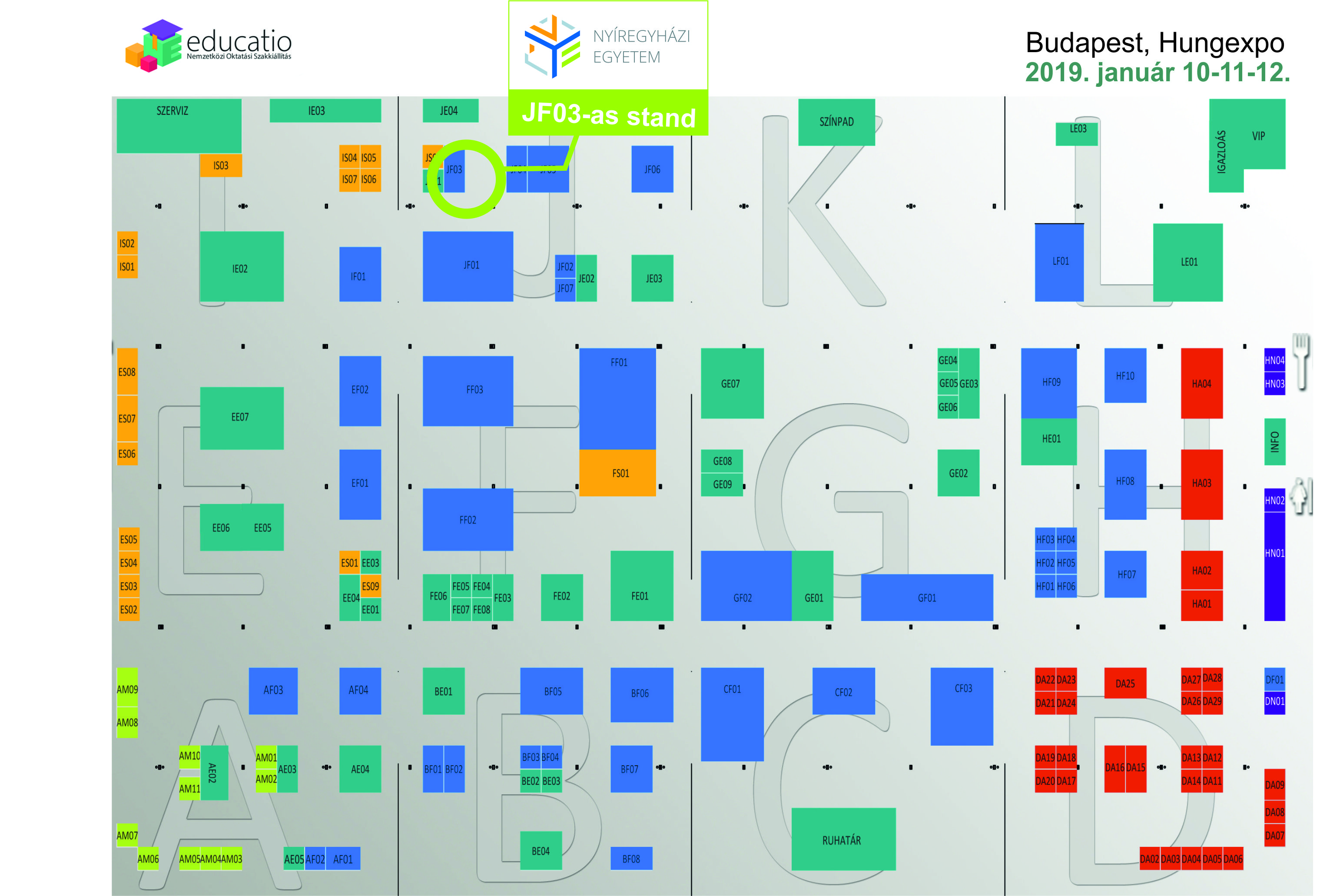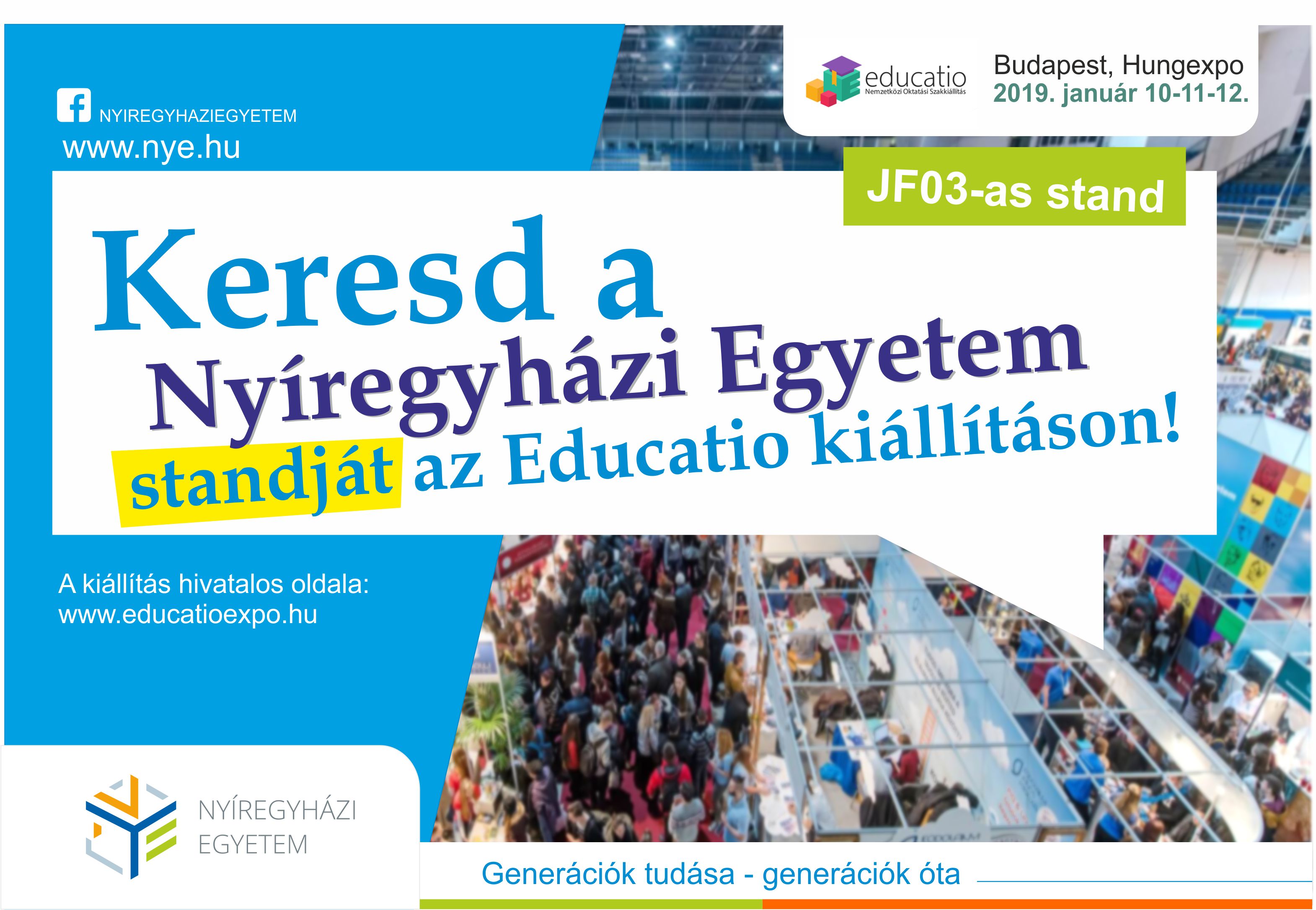 Az Educatio Oktatási Szakkiállítás forgatagában a Nyíregyházi Egyetemet a HUNGEXPO Budapesti Vásárközpont "A" csarnokának (1101 Budapest, Albertirsai út 10.) JF03-as standján találhatják meg a látogatók, ahol az egyetem munkatársai készséggel állnak az érdeklődők rendelkezésére. A LEGO Manufacturing Kft. standja az egyetem melletti JE01-es pavilon.