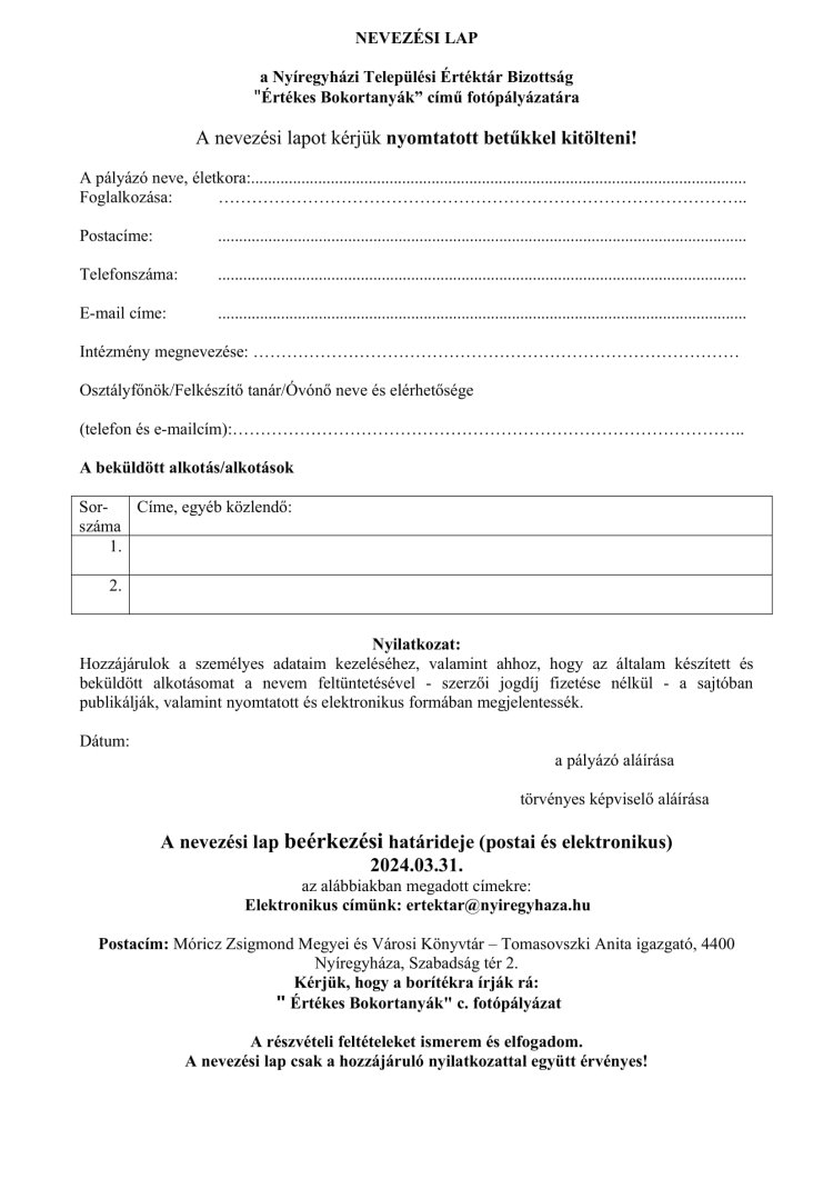 - Móricz Zsigmond Megyei és Városi Könyvtár – Tomasovszki Anita igazgató, 4400 Nyíregyháza, Szabadság tér 2. a borítékra írják rá: „Értékes Bokortanyák” c. fotópályázat