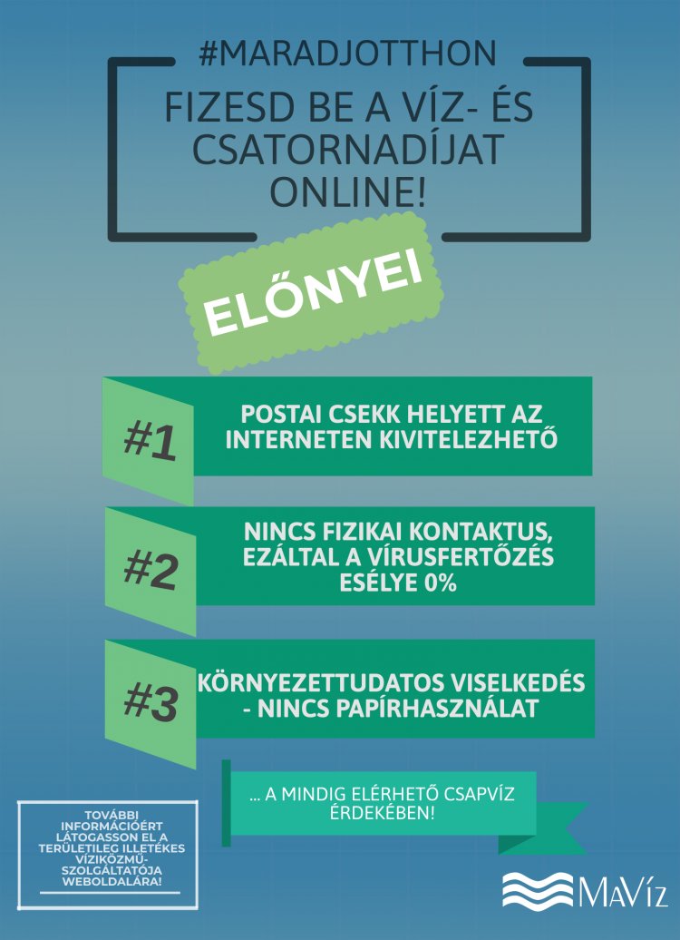 Szeretnénk hangsúlyozni, hogy a járvány idején különösen fontos, hogy határidőben térítsék meg a víz- és csatornadíjakat, hiszen ennek hiányában a szolgáltatók nem tudják kifizetni a dolgozók bérét, azoknak a névtelen hősöknek a munkáját, akik többek között az egészségügyi alkalmazottak, takarítók, bolti dolgozók mellett, 0-24 órában Önökért is dolgoznak. Teszik ezt azért, hogy minden otthonban elérhető legyen az egészséges csapvíz és megoldott legyen a szennyvíz szakszerű elvezetése és tisztítása.