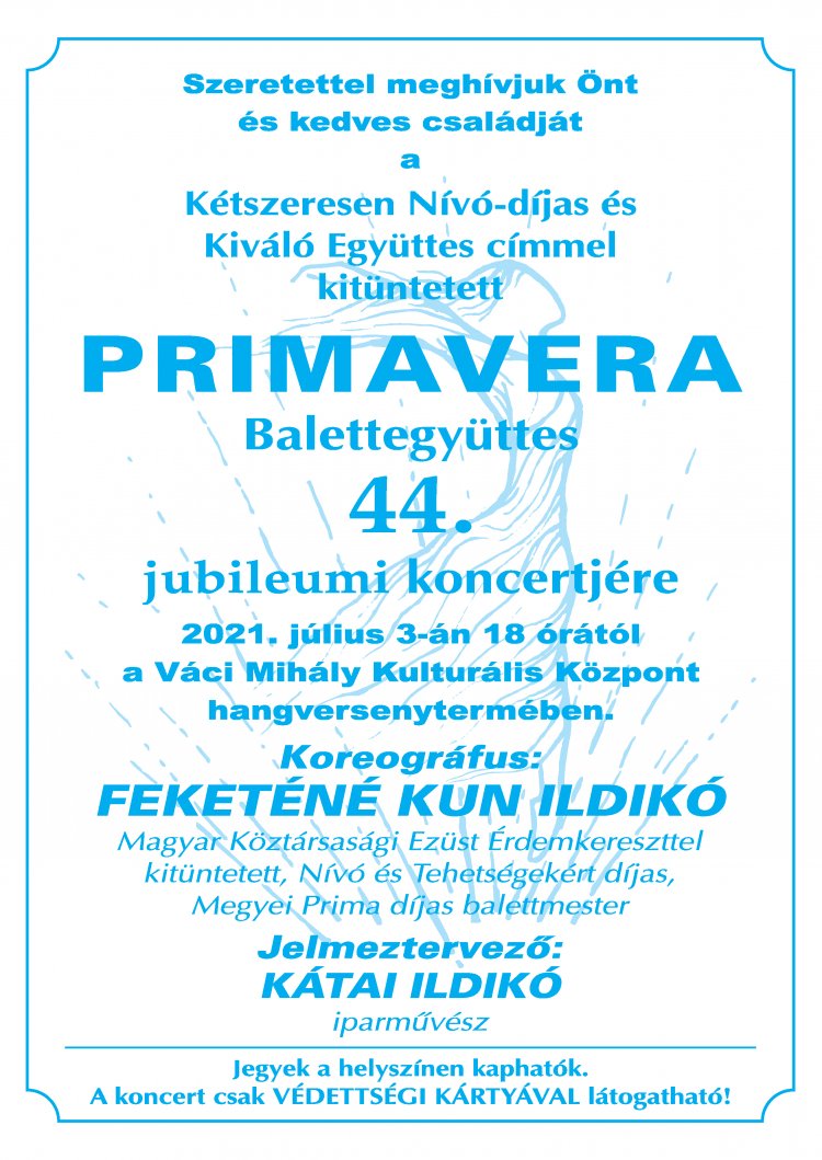 Július 3-án tartja 44. jubileumi koncertjét a Primavera Balettegyüttes a Váci Mihály Kulturális Központban. Koreográfus Feketéné Kun Ildikó Magyar Köztársasági Ezüst Érdemkereszttel kitüntetett, Nívó és Tehetségekért díjas, Megyei Prima díjas balettmester, a jelmezeket Kátai Ildikó iparművész tervezte.