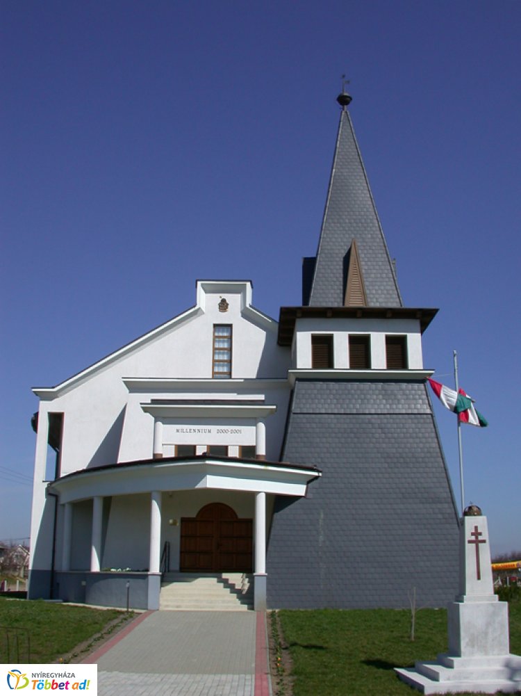 A templom az ezredfordulóra lett kész, és a nevezetes dátum miatt is eszébe jutott egy helybeli őslakosnak a településrész eltűnt Országzászlója, és azt is felállították a templom előkertjében. A trianoni béke évfordulóján nem felesleges felidézni ennek a mementó mozgalomnak az eredetét. 1928-ban Budapesten felavatták az elsőt, és ez akcióvá szélesedett. A Szent István-i Magyarországra emlékeztette a nemzetet a trianoni trauma után. Nyíregyházán 1934-ben állították fel Osváth Imre szobrát, amelyet irredentának minősítettek szellemisége miatt a háború után mindenhol – és városunkban is eltávolítottak. Az emlékműveket a régi kettős-keresztes középcímer ékesítette, és rúdján – a trianoni békére emlékezve – mindig félárbocra eresztett országzászló lengett. A városközponti szobor azóta sem faragtatott meg újra, de Sóstóhegy népe felállította a saját régi országzászlóját a templom előtt, amelyet Kulcsár Írisz Szent István bronzból öntött koronája díszít, és ez ellen nem lehet senkinek sem kifogása.