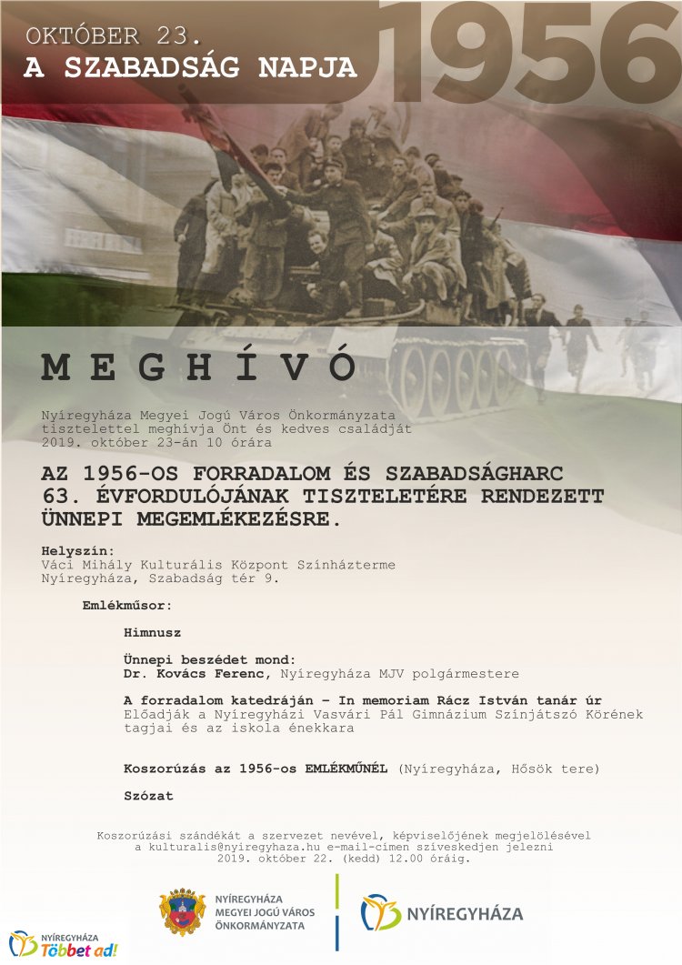 Az 1956-os forradalom és szabadságharc 63. évfordulójának tiszteletére ünnepi megemlékezést tart Nyíregyháza Megyei Jogú Város önkormányzata október 23-án. A megemlékezések már október 22-én megkezdődnek.