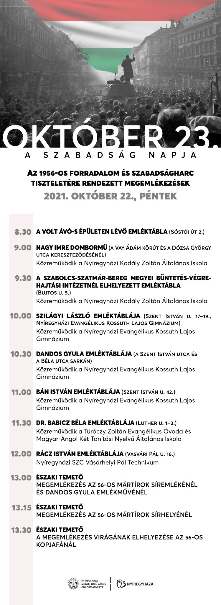 Az 1956-os forradalom és szabadságharc 65. évfordulójának tiszteletére ünnepi megemlékezést tart Nyíregyháza Megyei Jogú Város önkormányzata, október 22-én 16 órától a Hősök terén. A megemlékezések már reggel megkezdődnek. 8.30 órától kezdődően több mint tíz helyszínen emlékeznek az 1956-os őszi eseményekre.