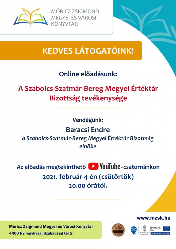 Baracsi Endre előadása várja az érdeklődőket február 4-én a Móricz Zsigmond Megyei és Városi Könyvtár YouTube-csatornáján. Az online előadás témája a megyei értéktár bizottság tevékenysége.