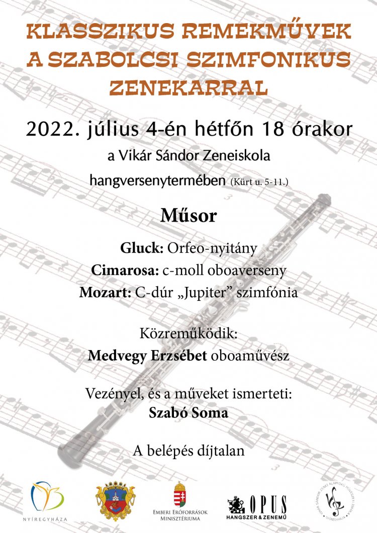 Klasszikus remekművek a Szabolcsi Szimfonikus Zenekarral július 4-én a Vikár Sándor Zeneiskola hangversenytermében.