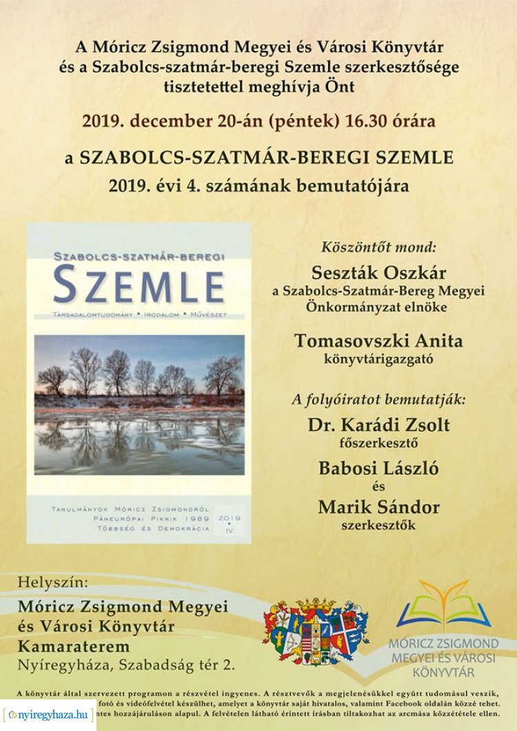 A Szabolcs-szatmár-beregi Szemle most megjelent idei 4. számát mutatja be a folyóirat szerkesztősége december 20-án a megyei könyvtárban.