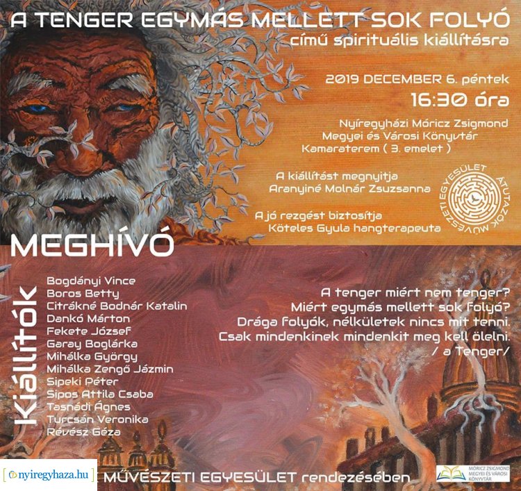 Az Átutazók Művészeti Egyesület rendezésében spirituális kiállítás nyílik december 6-án Nyíregyházán. A Móricz Zsigmond könyvtár kamaratermében tizenhárom alkotóművész mutatkozik be.