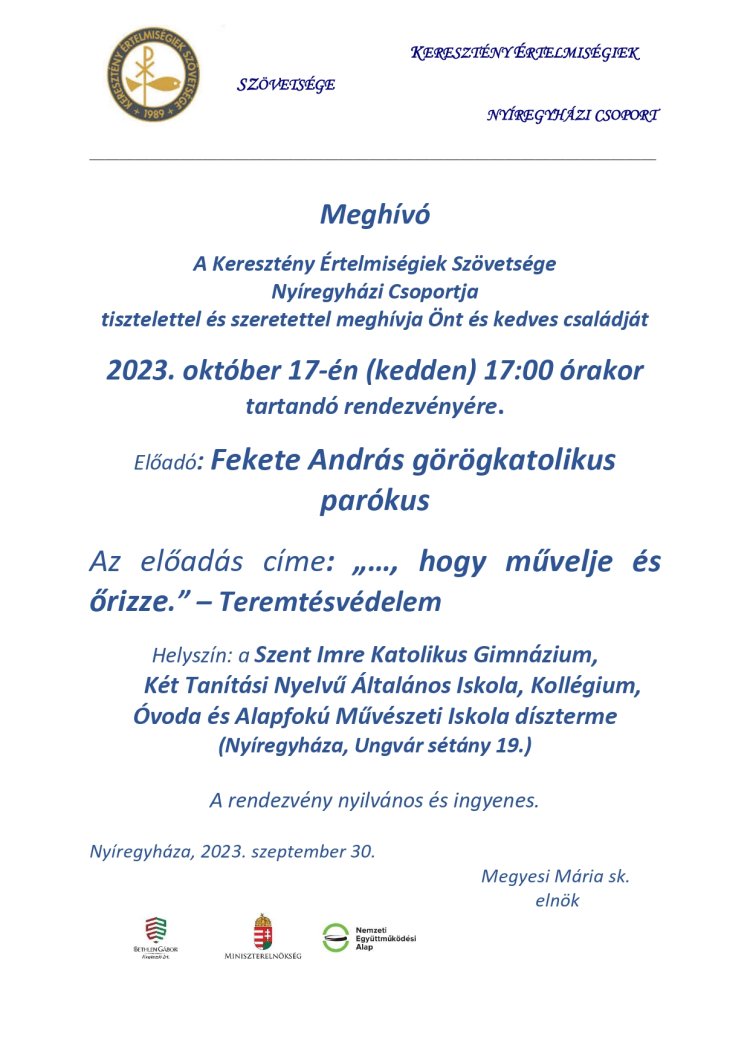 A Keresztény Értelmiségiek Szövetségének Nyíregyházi Csoportja 2023. október 17-én (kedden) 17 órakor előadást szervez.