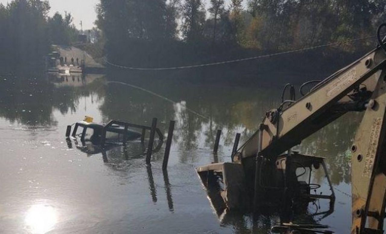 A tehergépkocsi a kompra próbált felállni, amikor annak kikötő lánca elszakadt és a teherautó a munkagéppel együtt a folyóba csúszott.