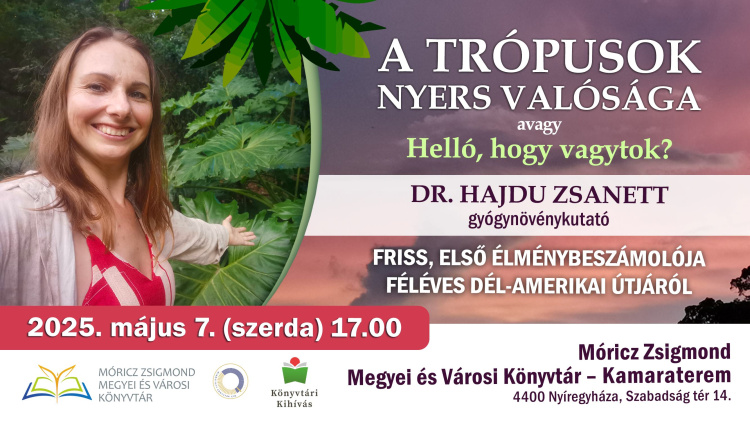 Hazaérkezése után egy héttel, élő módon, frissiben mesél élményeiről a brazíliai és bolíviai Amazónia világából. Ezúttal nem kutatni ment, hanem csak hogy megkérdezze: helló, hogy vagytok? És hogy magába szippantsa azt, ami van. Utoljára 16 éve látott ember- és növény barátaival találkozva újra lélekformáló történésekbe csöppent, ami tengernyi munícióval látta el a következő évtizedekre. Ezen az estén személyes történeteit hallhatjátok, mesél az Ember, a Természet, és az Ember és a Természet kapcsolatának aktuális valóságáról. Az előadást követően az előadás helyszíneiről korábban írt két könyve: A trópusok ajándékai és a Mesterek és gyógynövények megvásárolható (4500 Ft/db) és dedikáltatható. A programra a belépés ingyenes!