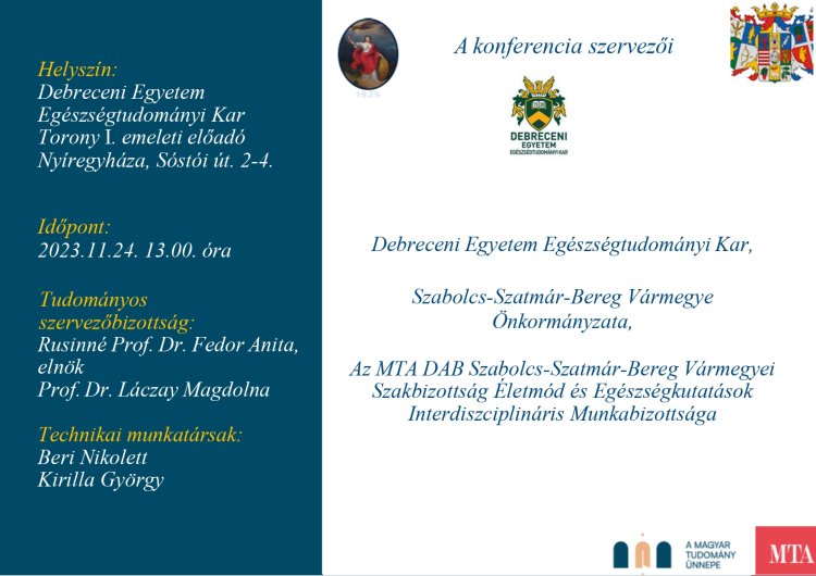 Helyszín: Torony I. emeleti előadó, Debreceni Egyetem Egészségtudományi Kar (Nyíregyháza, Sóstói út 2-4.)