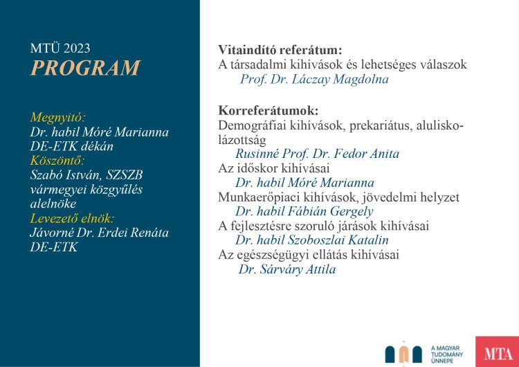 Az észak-alföldi régió, ezen belül elsősorban a szabolcs-szatmár-beregi térségre jellemző társadalmi kihívásokról, az elmúlt évek tudományos kutatásainak eredményeiről, az időskori és a munkaerőpiaci kihívásokról, az egészségügyi ellátás aktuális kérdéseiről számolnak be tudományos előadásokon a Debreceni Egyetem Egészségtudományi Karának szakemberei 2023. november 24-én, pénteken 13 órától az ETK-án. A Magyar Tudományok Ünnepe rendezvényhez kapcsolódó eseményt a Debreceni Egyetem Egészségtudományi Kara, az MTA DAB Szabolcs-Szatmár-Bereg Vármegyei Szakbizottságának Életmód és Egészségkutatások Interdiszciplináris Munkacsoportja, valamint a Szabolcs-Szatmár-Bereg Vármegyei Önkormányzat közösen szervezi.