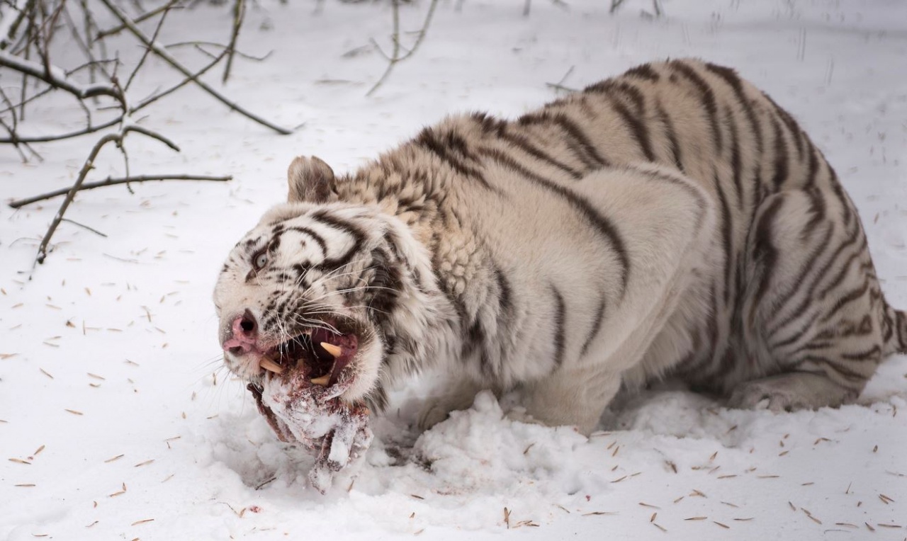 Fehér bengáli tigris (Panthera tigris tigris) eszik a vadvilág világnapján rendezett látványetetésen a Nyíregyházi Állatparkban 2018. március 3-án. Az ENSZ Közgyűlése 5 éve döntött arról, hogy március 3-át a vadvilág világnapjává nyilvánítja, mert a veszélyeztetett vadon élő állat- és növényfajok nemzetközi kereskedelméről szóló egyezményt (CITES) ezen a napon fogadták el.