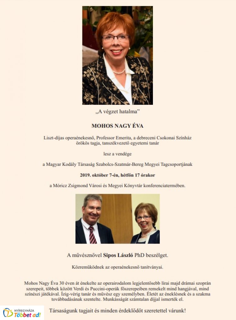 Mohos Nagy Éva Liszt-díjas operaénekesnő lesz a Kodály Társaság vendége október 7-én, a Móricz Zsigmond könyvtárban. A művésznővel Sipos László beszélget.