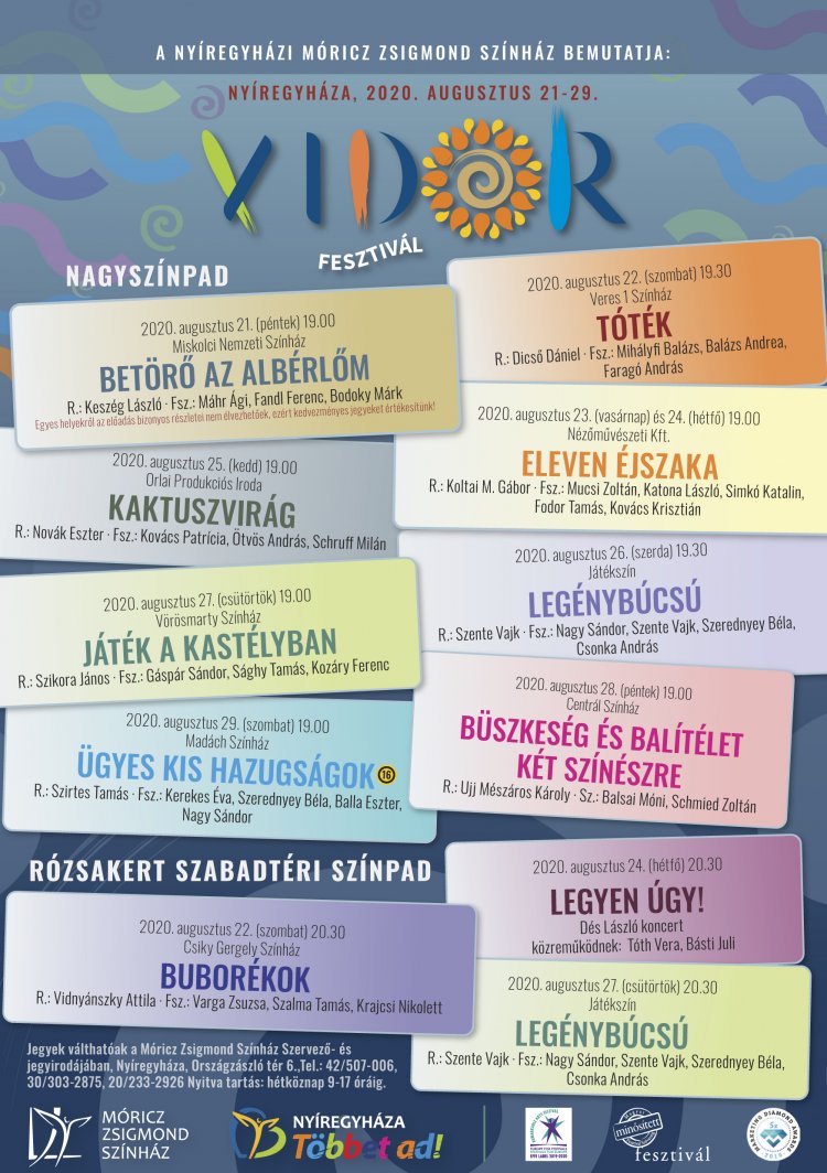 Bár rendkívüli körülmények előzték meg a szervezési munkálatokat, a VIDOR Fesztivál nézői idén sem maradnak nívós, és izgalmas színházi versenyprogram nélkül. A közönség számos kedvencével találkozhat újra, itt lesz többek között az Orlai Produkció „színeiben” Kovács Patrícia és Ötvös András (Kaktuszvirág, rendező: Novák Eszter), a Játékszín Legénybúcsú című előadása Szerednyey Béla, Nagy Sándor, Csonka András, valamint Szente Vajk szereplésével, és utóbbi rendezésében is. Szerednyey Béla, Nagy Sándor, a Móricz Zsigmond Színház színpadán már szereplő Kerekes Évával és Balla Eszterrel is színpadra lép a Madách Színház Ügyes kis hazugságok darabjában (rendező: Szirtes Tamás). Gáspár Sándor a Szikora János nevével fémjelzett Molnár Ferenc műben, a Játék a kastélyban (Vörösmarty Színház), Balsai Móni és Schmied Zoltán a Büszkeség és balítélet két színészre alkotásban (Centrál Színház, rendező: Ujj Mészáros Károly), Mucsi Zoltán és Fodor Tamás a Nézőművészeti Kft. és a Szkéné Színház közös produkciójában, az Eleven éjszaka előadásban (rendező: Koltai M. Gábor), Börcsök Enikő pedig Soós Péter rendezésében, a Pinceszínház Háy János: A Gézagyerek darabjában szerepel. Bemutatkozik a Miskolci Nemzeti Színház a Betörő az albérlőm című vígjátékkal, Keszég László rendezésében, az Aranytíz a Szőcs Artur nevével fémjelzett Csehov-egyfelvonásosokkal.