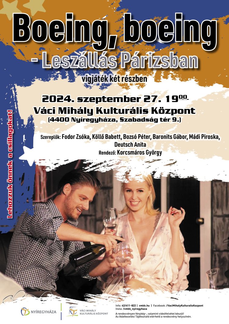 Jön a "Boeing, boeing - Leszállás Párizsban"- kétfelvonásos vígjáték a Váci Mihály Kultúrális Központba. Nevetésre felkészülni, leszállunk Párizsban! Egy felejthetetlen este garantált!
