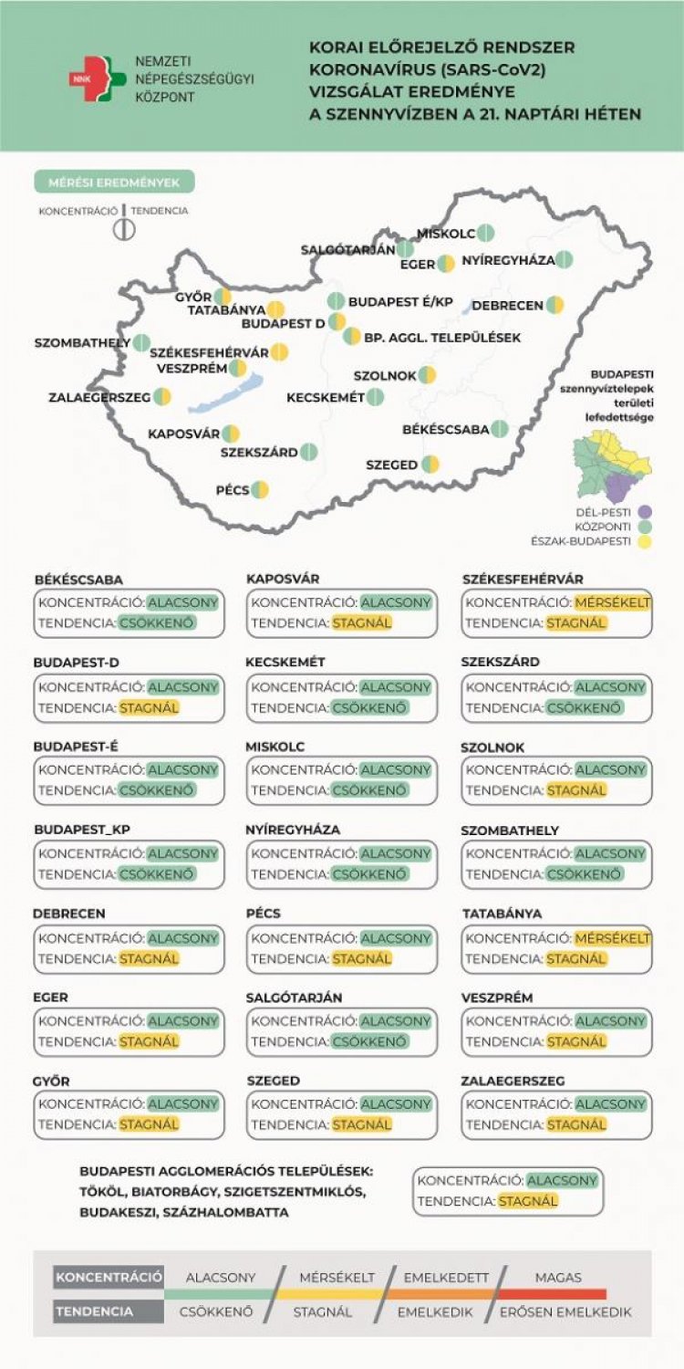Emelkedő tendencia egyetlen vizsgált város mintájában sem tapasztalható, csökkenés 9 helyszínen (Békéscsabán, Budapest északi és központi szennyvíztisztítójában, Kecskeméten, Miskolcon, Nyíregyházán, Salgótarjánban, Szekszárdon és Szombathelyen) észlelhető, a többi helyszínen a tendencia stagnál. 22 vizsgált szennyvíz-minta közül 20-nál alacsony, 2-nél mérsékelt koronavírus-koncentráció volt mérhető.
