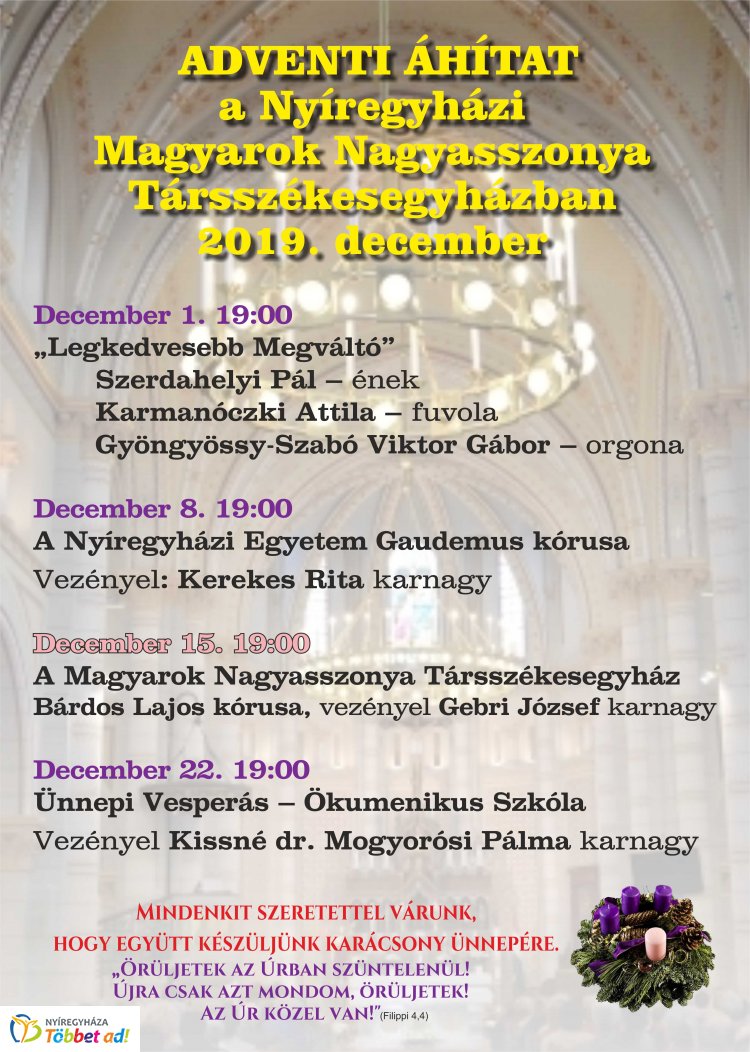 Karácsonyváró dallamok csendülnek fel december 1. és 22. között, vasárnap esténként a Nyíregyházi Magyarok Nagyasszonya Társszékesegyház falai között.