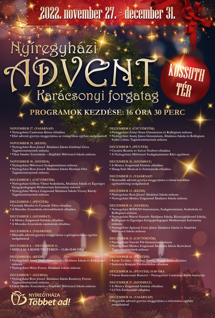 Az adventi időszakban - hétfő kivételével - minden nap 16.30-tól helyi művészek, ill. oktatási intézmények diákjai kedveskednek adventi műsorral a Városháza előtt felállított színpadon.