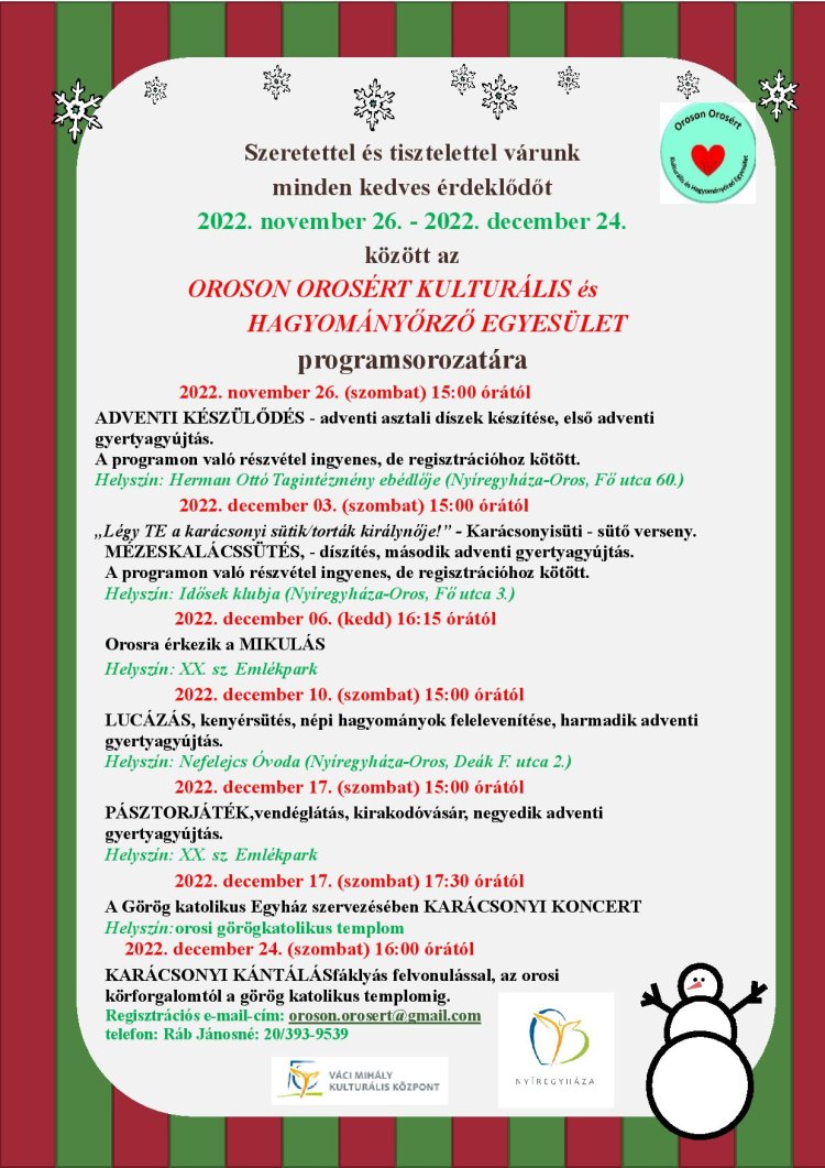 November 26-tól egészen december 24-ig hét alkalommal szervez ünnepi programokat az Oroson Orosért Kulturális és Hagyományőrző Egyesület.