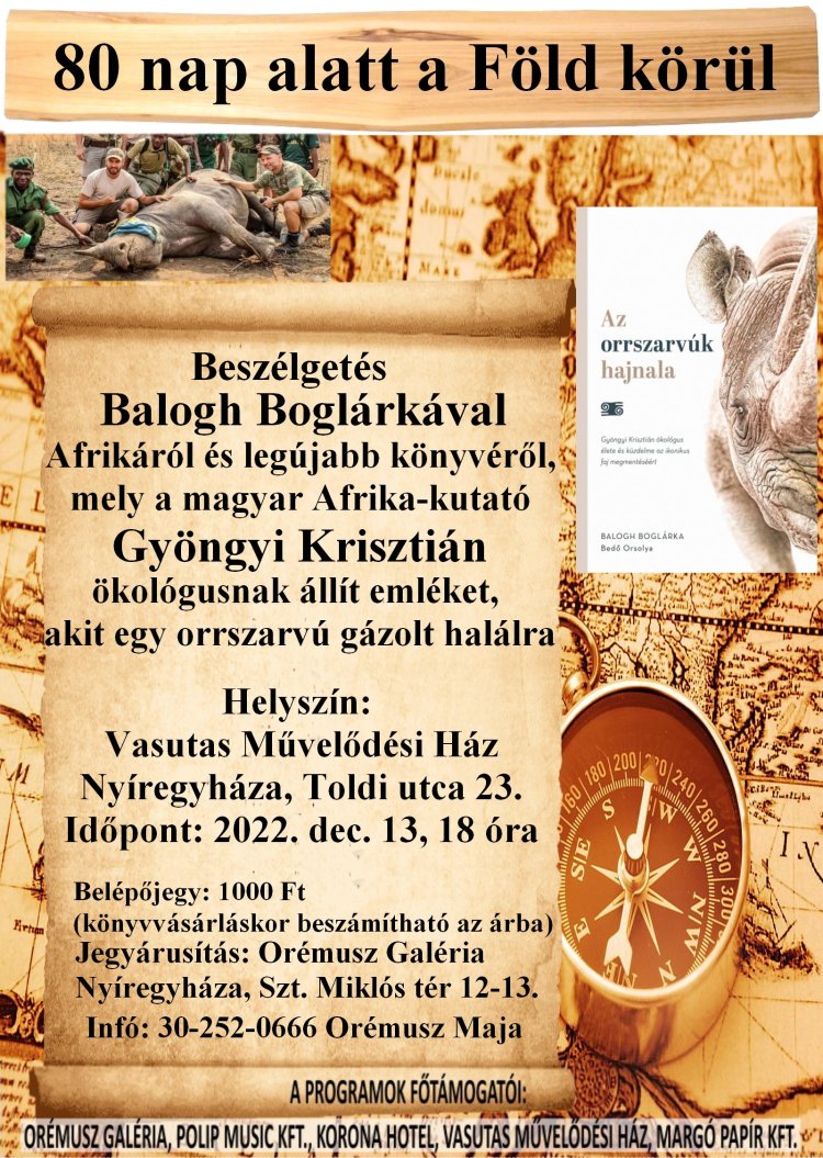 A világutazó író ezúttal az orrszarvúkutató Gyöngyi Krisztiánról készített könyvet, kit épp az ikonikus állat gázolt halálra. Miközben az ökológus életét idézik az érdeklődők elé, a fekete földrész varázsát is átélheti a közönség az Orémusz Maja által szervezett műsorban, mely 18 órakor kezdődik a Vasutas Művelődési Házban.