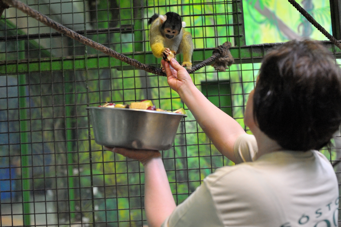 Már javában tart a bolíviai mókusmajmok kifutójának takarítása, amikor mi is odaérünk. Bea, a gondozó ott van köztük, és mint mondja, az sem meglepõ, hogy a vállára csimpaszkodnak fel az apró állatok.