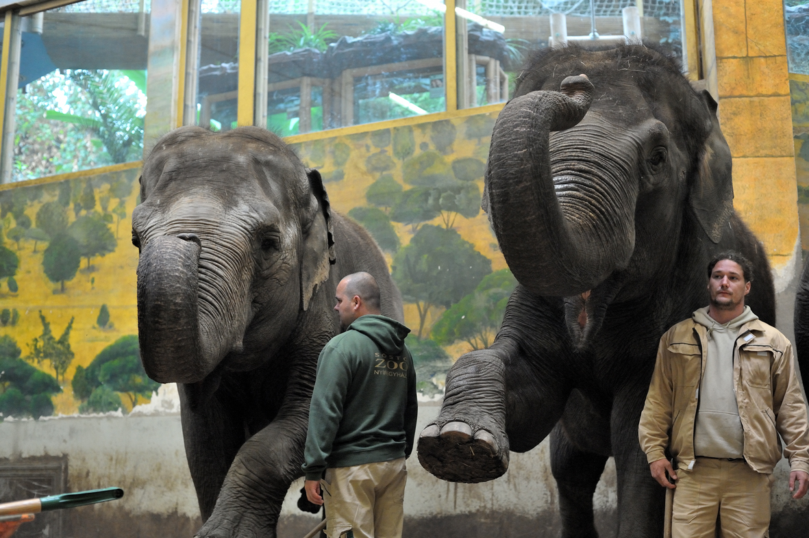 Benéztünk a park „központjába”, a konyhába, ott voltunk a bolíviai mókusmajmok etetésénél, az elefánttrágya-takarításnál, figyeltük a fókák reggeli tréningjét, de testközelbõl láttuk azt is, amint a búvárok lemerülnek a cápák közé, hogy fényesre tisztítsák az 500 ezer literes akvárium paneljét. Kulisszák mögött a Nyíregyházi Állatparkban...