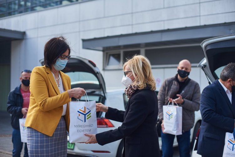 „Úgy érezzük, hogy az itt végzett munka miatt akár a frontvonalban, akár az oltópontokon dolgozóknak nem győzzük kifejezni a köszönetünket. Az ajándékcsomag, amit összeállítottunk az összegyűlt pénzből, azt a célt szolgálja, hogy a mindennapok megpróbáltatásait valamilyen módon könnyebbé tegyük egy kávéval, egy teával, egy kis édességgel. Amikor pedig a kezükbe veszik a táskát vagy a tőlünk kapott jegyzettömböt, jusson eszükbe a Nyíregyházi Egyetem is, az a munkahelyi közösség, akik nagyon nagy szeretettel nyújtották át a mai napon az adományokat” – mondta Halkóné dr. Rudolf Éva, a Nyíregyházi Egyetem kancellárja.