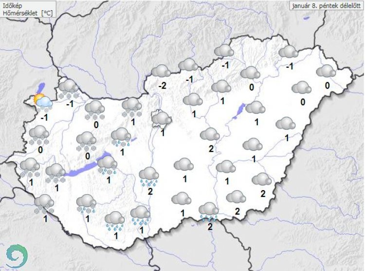 A Dunántúlon havazás, a délebbi részeken havas eső, hó várható. Leginkább a Dunántúli-középhegységben, Zalában, illetve a Dél-Dunántúlon főként a Mecsekben, illetve a magasabban fekvő dombvidéki tájakon néhány centiméteres vizes, tapadó hóréteg kialakulása várható, de több helyen az olvadás mellett inkább csak átmeneti lepelnyi hó lesz a jellemző.
