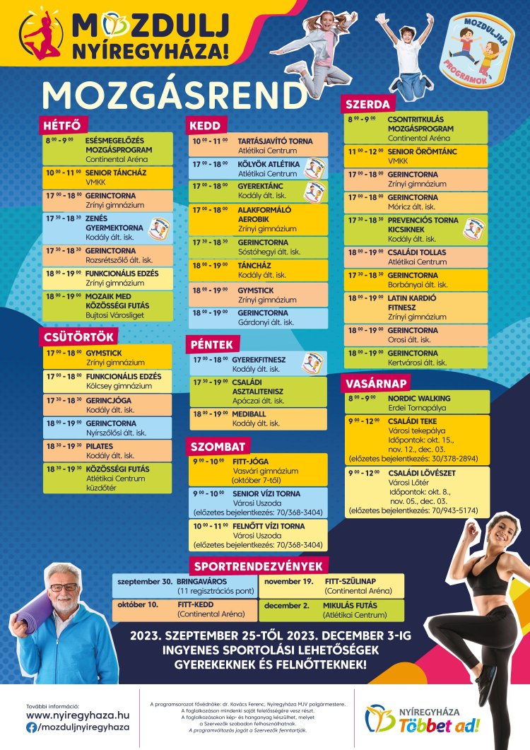 Szeptember 25-től újra Mozdulj Nyíregyháza!, vagyis folytatódik az önkormányzat nagysikerű, ingyenes mozgásprogram-sorozata, ami ezúttal is még gazdagabb kínálattal várja a sportolni vágyókat. A foglalkozások között minden korosztály megtalálhatja az edzettségének megfelelőt, vagy éppen a kedvére való.