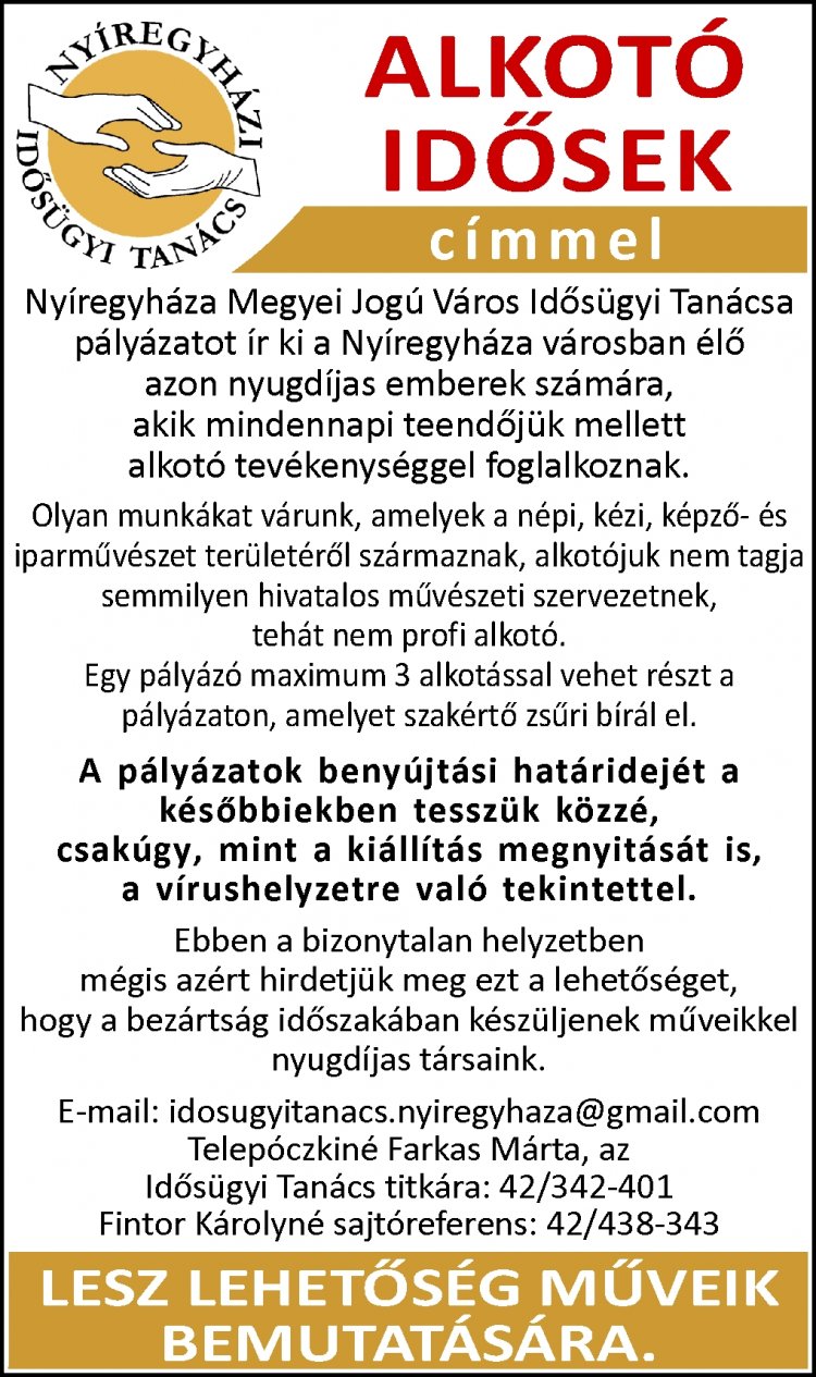 Alkotó idősek címmel Nyíregyháza MJV Idősügyi Tanácsa pályázatot ír ki a városban élő azon nyugdíjasok számára, akik mindennapi teendőjük mellett alkotó tevékenységgel foglalkoznak. A pályázatok benyújtási határidejét a későbbiekben teszik közzé.