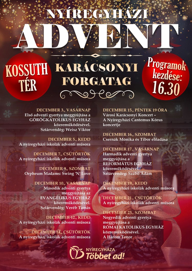 – tájékoztatott az adventi programokról a polgármester, dr. Kovács Ferenc. A háromhetesre szűkült adventet úgy lehet megnyújtani, hogy november 25-én már kinyit a forgatag. A motoros Mikulások aztán advent első vasárnapján, december 3-án a Nyír Plaza parkolójából indulnak egy jótékonysági felvonulás keretében a Kossuth térre. A korábbiaknál gazdagabb és teljesebb adventi programról szólt a nyíregyházi adventi sajtótájékoztató.