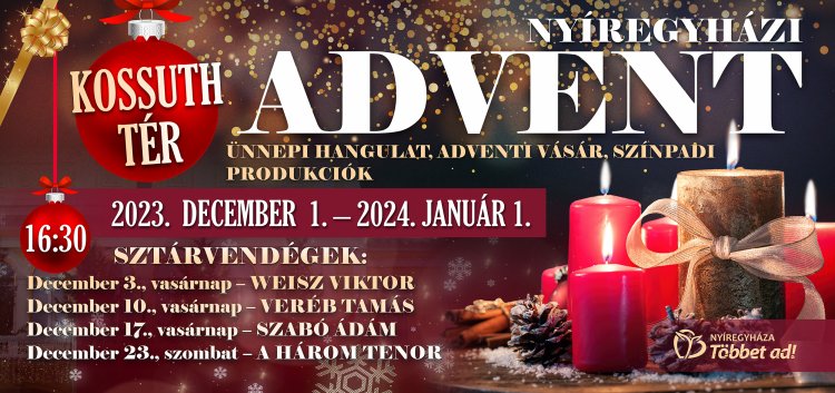– mondta az ünnepi készülődés kapcsán az alpolgármester, dr. Ulrich Attila. Már most áldott ünnepeket kívántak a város vezetői a nyíregyháziaknak, és azt, hogy érezzék jól magukat családjuk, barátaik társaságában a város főterén, mely igazi hangulatos, karácsonyi illatú közösségi térré válik a következő hetekben. A Kossuth téren nyitva lesz a Mikulás-ház és helyére kerül a betlehemi jászol is. A hagyományos karácsonyi hangversenyt a Magyarok Nagyasszonya-társszékesegyházban mutatja be december 15-én a Cantemus Kórus és a Szabolcsi Szimfonikus Zenekar. A hétköznapi, keddi és csütörtöki programok szereplői nyíregyházi iskolások. A hétvégi sztárvendégek között pedig Weisz Viktor, Veréb Tamás, az Orpheum Madams, Szabó Ádám, a Csernák házaspár, de a Három Tenor is szerepel majd. Szilveszter éjjelén utcabál és diszkó zárja az ünnepet a nyíregyházi Kossuth téren.