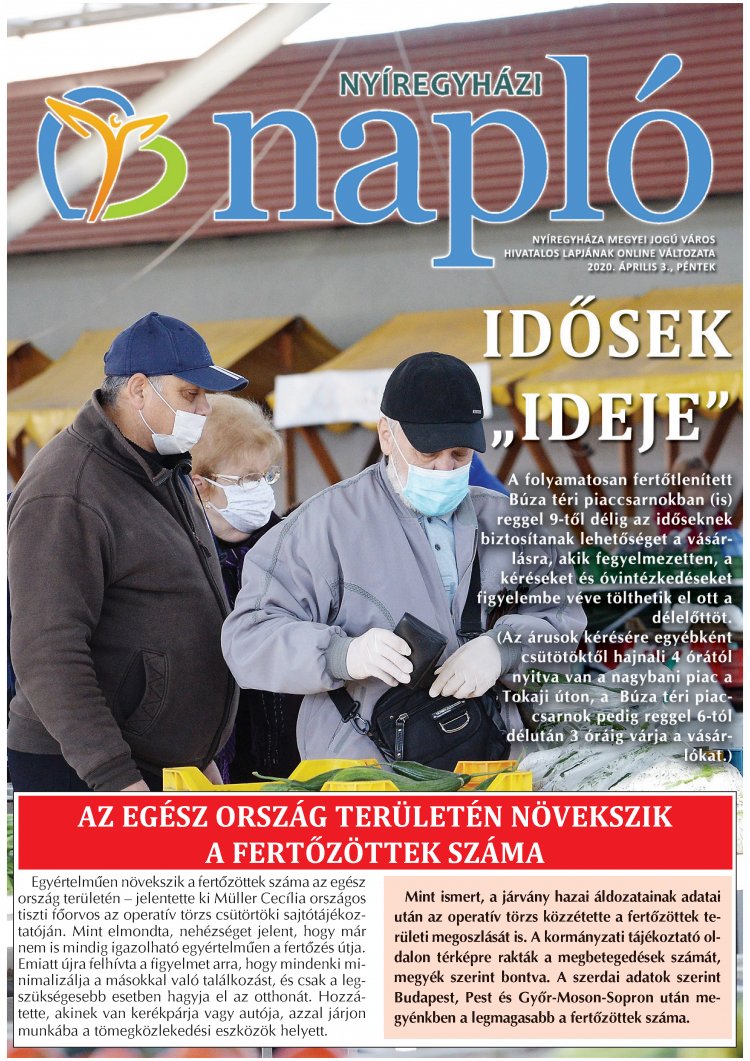 - A folyamatosan fertőtlenített Búza téri piaccsarnokban (is) reggel 9-től délig az időseknek biztosítanak lehetőséget a vásárlásra, akik fegyelmezetten, a kéréseket és óvintézkedéseket figyelembe véve töltik el ott a délelőttöt.