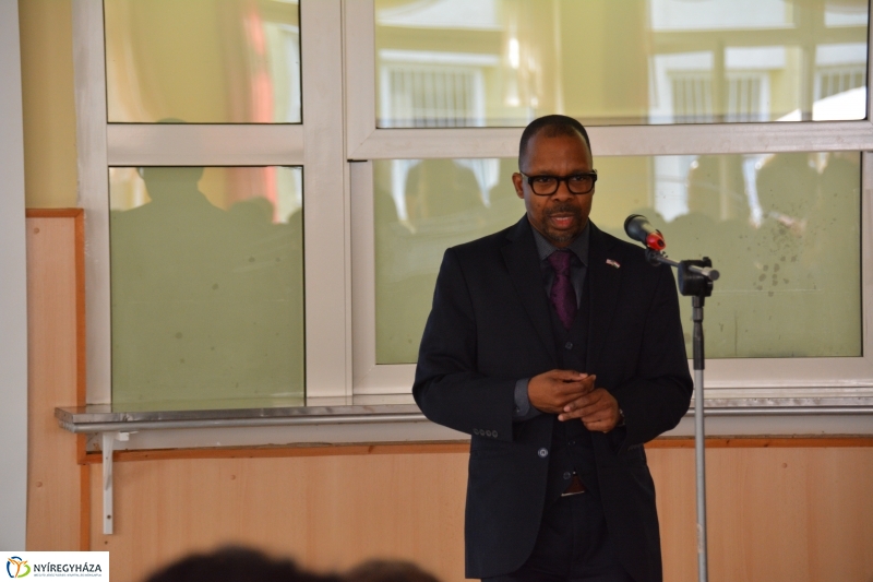 Amerikai zászlóval és magyar tánccal fogadták az Amerikai Nagykövetségről érkezett vendégeket a Krúdy Gyula Gimnáziumban. Az iskola előcsarnokában pedig minden az Amerikai Egyesült Államokról szólt.