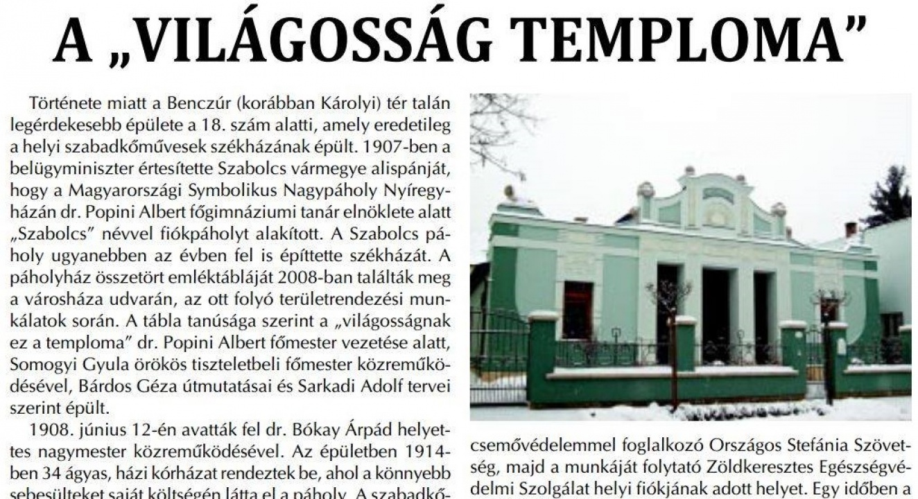 Története miatt a Benczúr (korábban Károlyi) tér talán legérdekesebb épülete a 18. szám alatti, amely eredetileg a helyi szabadkőművesek székházának épült.1907-ben a belügyminiszter értesítette Szabolcs vármegye alispánját, hogy a Magyarországi Symbolikus Nagypáholy Nyíregyházán dr. Popini Albert főgimnáziumi tanár elnöklete alatt „Szabolcs” névvel fiókpáholyt alakított. A Szabolcs páholy ugyanebben az évben fel is építtette székházát. A páholyház összetört emléktábláját 2008-ban találták meg a városháza udvarán, az ott folyó területrendezési munkálatok során.