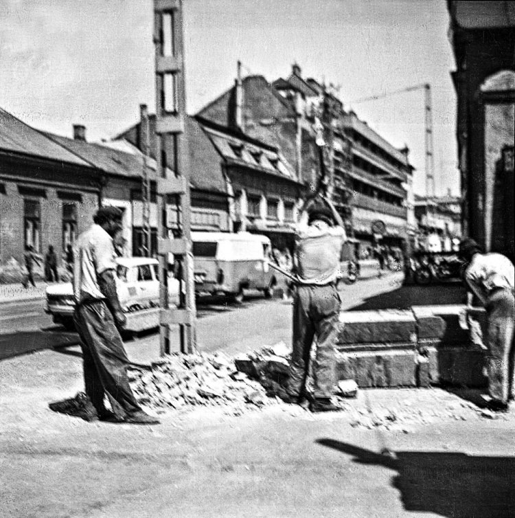 Ma már a képen az Általános Hitelintézet mellett látható épületek sem állnak, de ezekről majd a következő részben. Most még essék szó arról, hogy a nyíregyházi villamos utoljára 1969. május 31-én, éjfélig közlekedett, míg a kisvonat június 30-án dudált egy utolsót a városon keresztül haladva. Ezt követően álltak neki a kisvasút sínjeinek és a villamos felső vezetékeinek a bontásához a városközpontban. Ez az adat is segít a képek készítési idejének a meghatározásában, hiszen a síneket már felszedték és az utcát is aszfaltozták. Az időpont pontosabb meghatározásában majd a következő részben bemutatott kép fog a segítségünkre szolgálni...