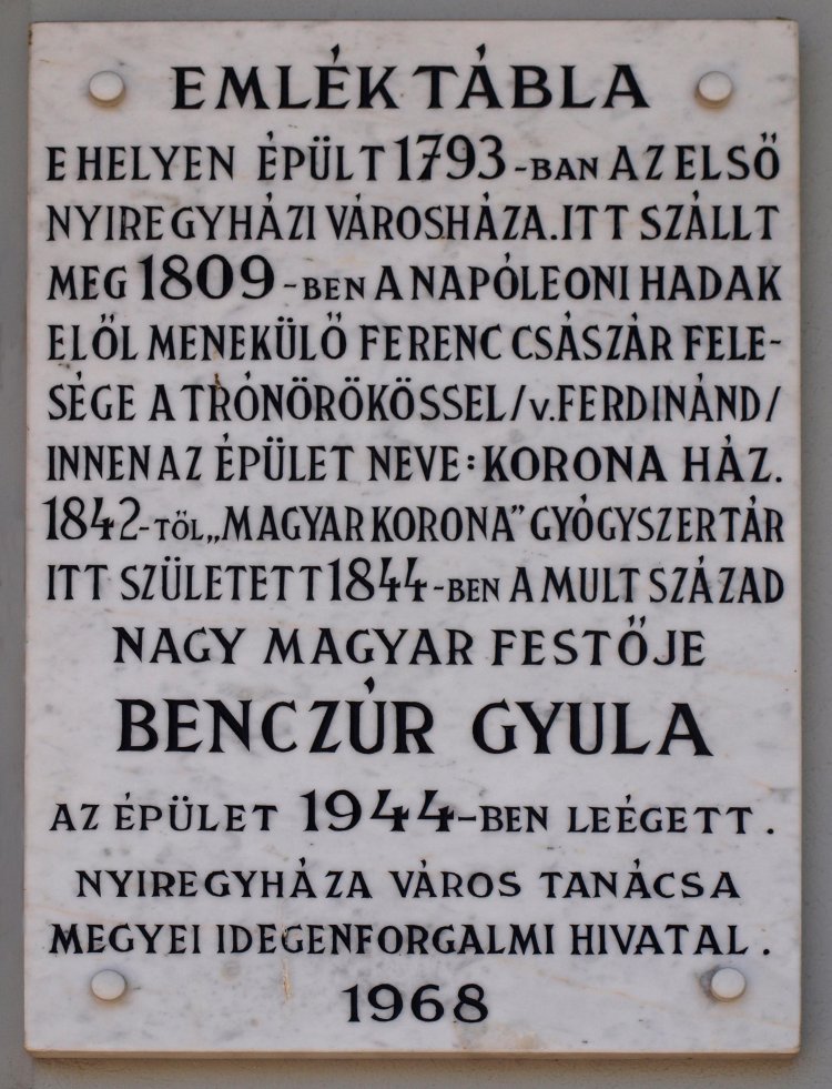 A jól induló vállalkozás később csődbe jutott, az 1842-ben tartott árverésen a kezességet vállaló édesapa vásárolta meg és rögtön tovább is adta Benczúr Vilmos patikáriusnak, aki 1847-ig üzemeltette. Egy 1844-ben keltezett számlán először fedezhető fel a patika cégére „Gyógyszertár a magyar koronánál Nyíregyházán” felirattal, alatta a Szentkorona rajza, legalul pedig Benczúr Vilmos aláírása. Ebben a mai Kossuth tér déli sarkán található házban látta meg a napvilágot 1844-ben Benczúr Gyula, ahogyan ezt az épület helyén álló üzletház falán elhelyezett emléktábla is hirdeti.