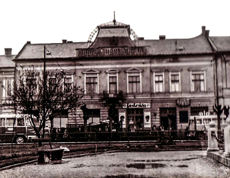 A tér kettes számú épületéről 1965-ben készült fotón látható az a fodrászüzlet, amelyet az előző részben említettünk. A mellette lévő felirat az egykori MÁVAUT vidéki irodáját hirdette.