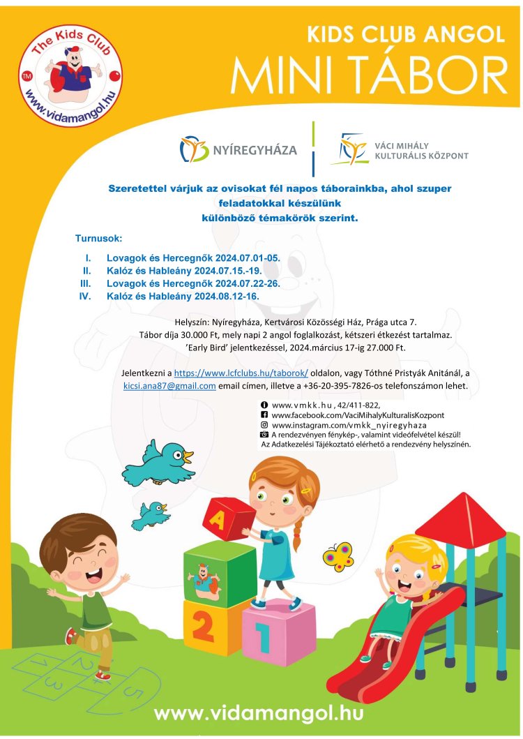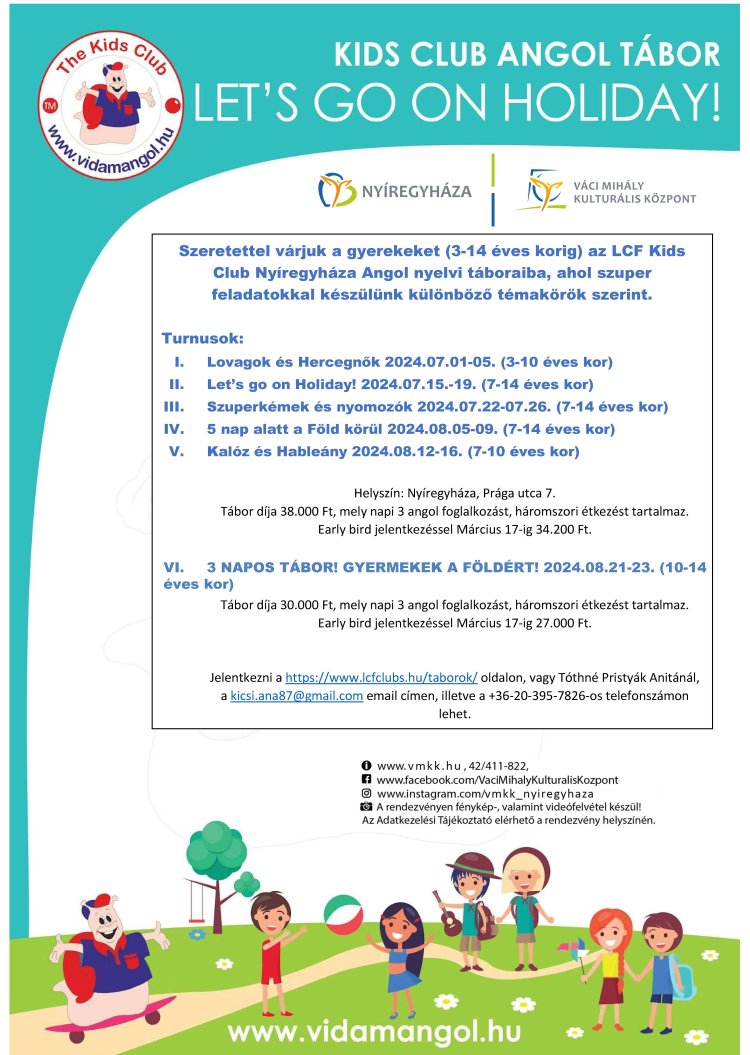 Kids Club Angol Tábort szerveznek Nyíregyházán. A fél napostól az öt naposig többféle lehetőség közöl válogathatnak majd a szülők. A táborokat júliusban és augusztusban tartják, ám aki korán regisztrál, jobban jár!