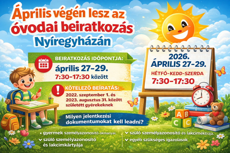Április 27. és 29. között tartják a 2026/2027-es nevelési évre szóló óvodai beiratkozást a nyíregyházi önkormányzati fenntartású intézményekben. A jelentkezés mindhárom napon 7:30 és 17:30 között lesz.