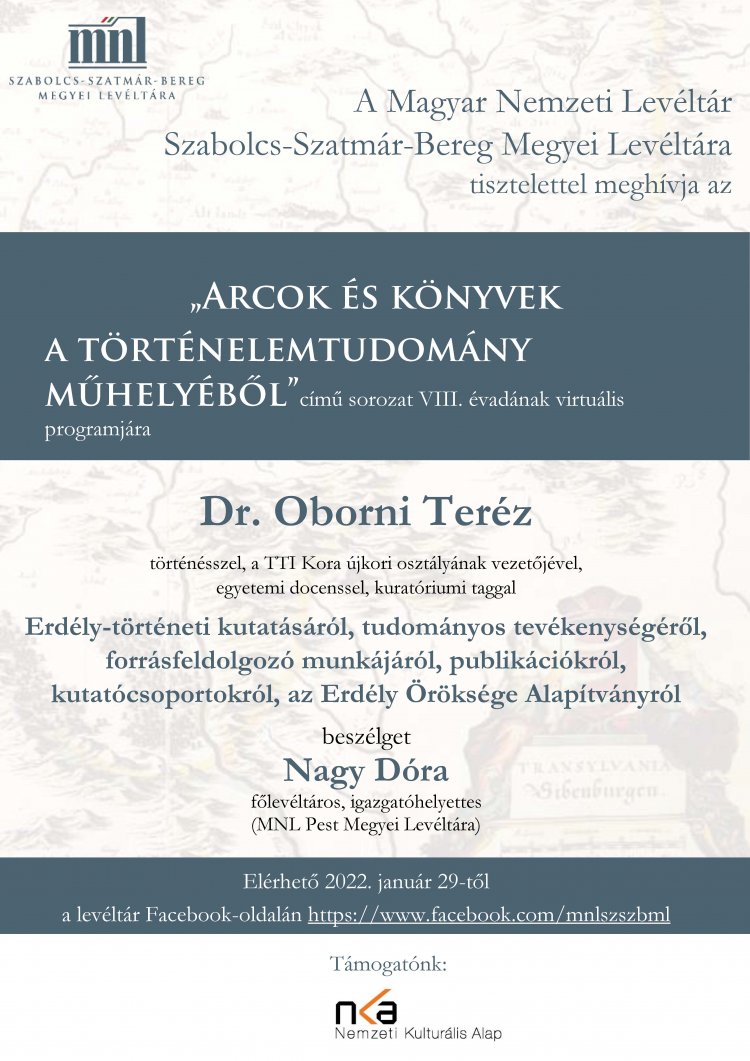 A Szabolcs-Szatmár-Bereg Megyei Levéltár Arcok és könyvek a történelemtudomány műhelyéből című, beszélgető-sorozatában két Erdélyt kutató történész, Oborni Teréz és Nagy Dóra beszélget a legújabb kutatási irányokról, megjelent írásokról. A program 2022. január 29-től érhető el a levéltár Facebook-oldalán. A rendezvény támogatója az NKA.