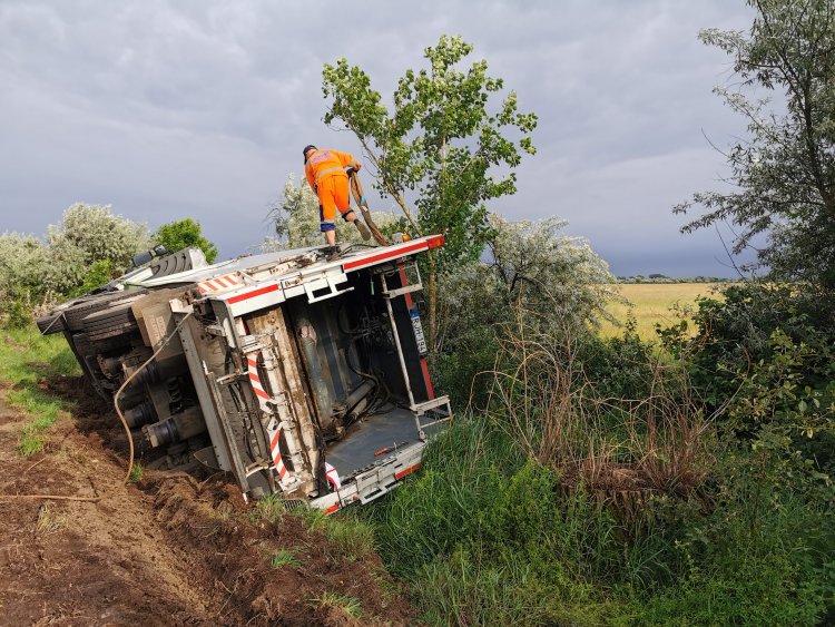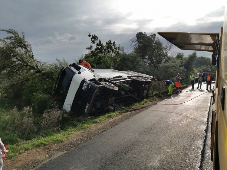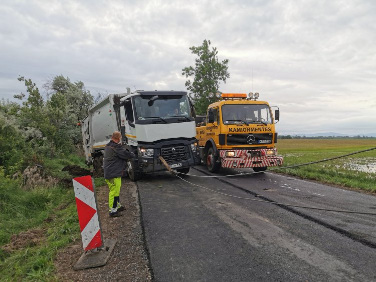 Árokba borult egy teherautó Tiszanagyfalunál. A jármű az út szélén megállt, az elmúlt napok csapadékos időjárása miatt felázott padka viszont megcsúszott alatta, a teherautó pedig az árokba borult. A mentés idejére az utat teljesen le kellett zárni.