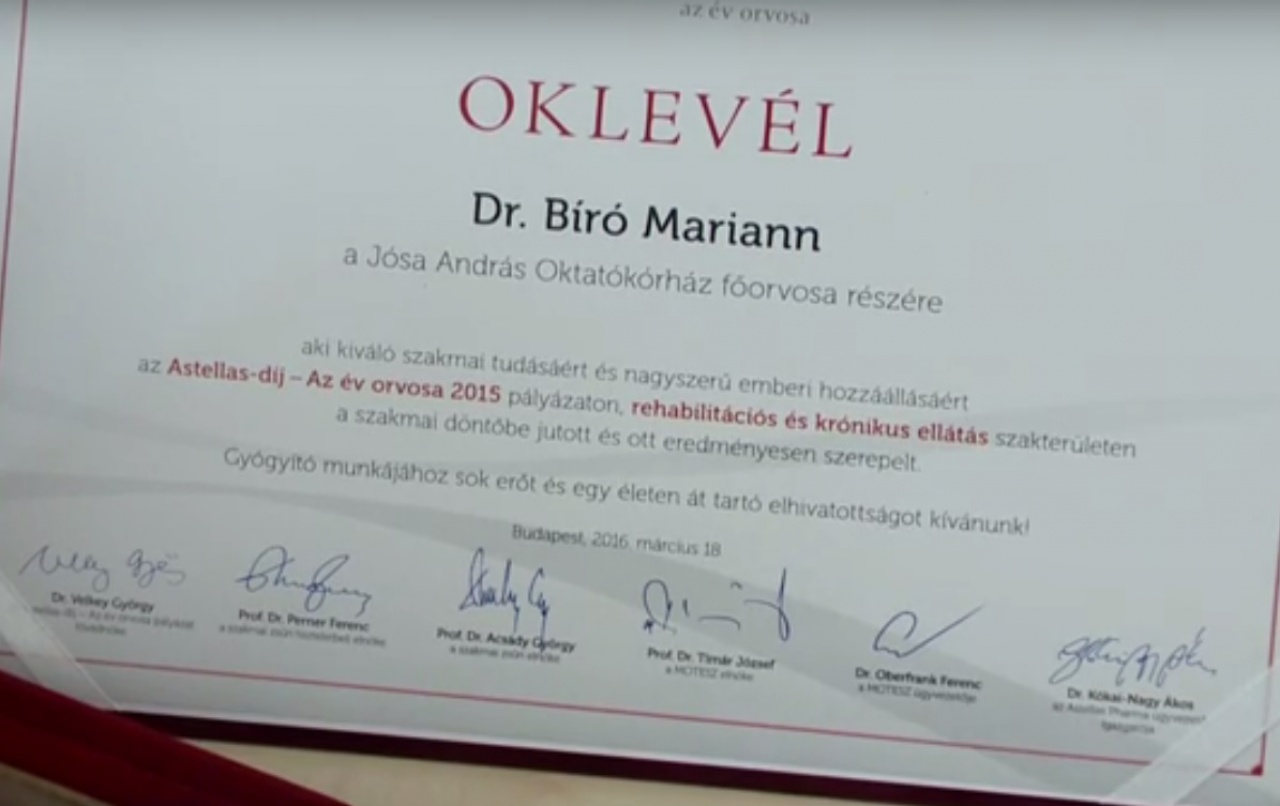 „Jól képzett, kompetens szakember, rendkívüli empátiás készséggel, nyitottsággal és olyan erővel, amely nagyszerű vezetővé, szakemberré, orvossá teszi őt” – így jellemezték dr. Bíró Mariannát, a Jósa András Oktatókórház Gyermekrehabilitációs Osztályának szakorvosát munkatársai abban az ajánlólevélben, amelyben felterjesztették az Astellas-díjra, az Év orvosa 2015-ös pályázatára.