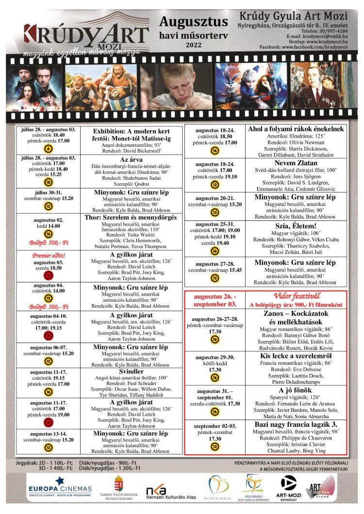 Augusztusi műsor a Krúdy Gyula Art Moziban