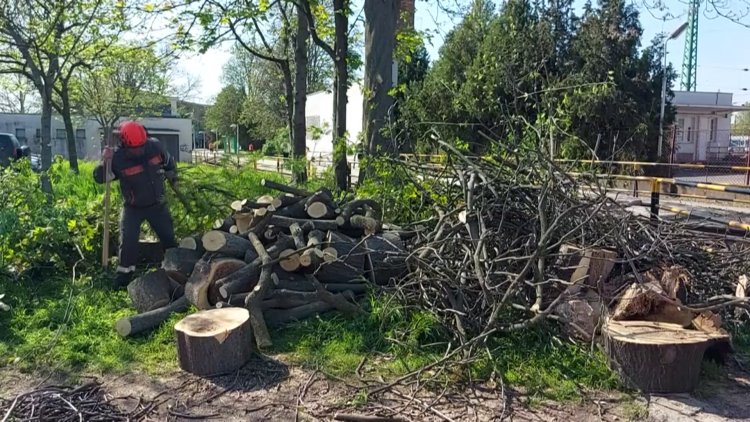 Az Állomás téren, a Nyírvidéki kisvasút pályája mellett egy kettéhasadt korhadt fát távolítottak el.