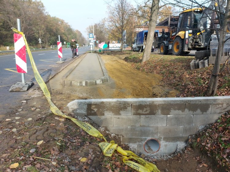 Megújul a buszmegálló a Nyíregyházi Állatpark előtt! Peronmagasítást végeznek, és a megállóhely mögötti szikkasztóárokba csatornát helyeztek, így be lehetett temetni, ezáltal biztonságosabb lett a várakozás.
