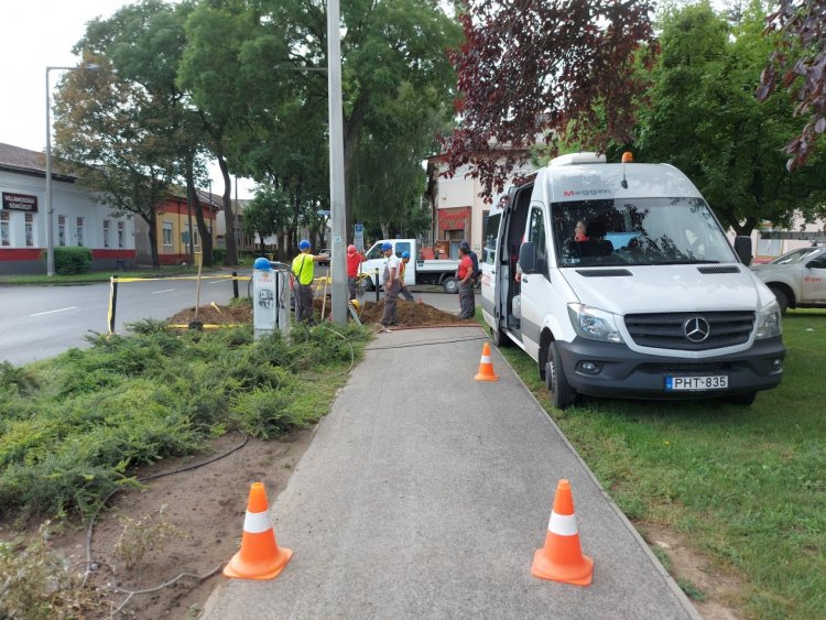 Az E.ON munkatársai a Dózsa György utcánál az erősáramú kábelek cseréjét végzi.
